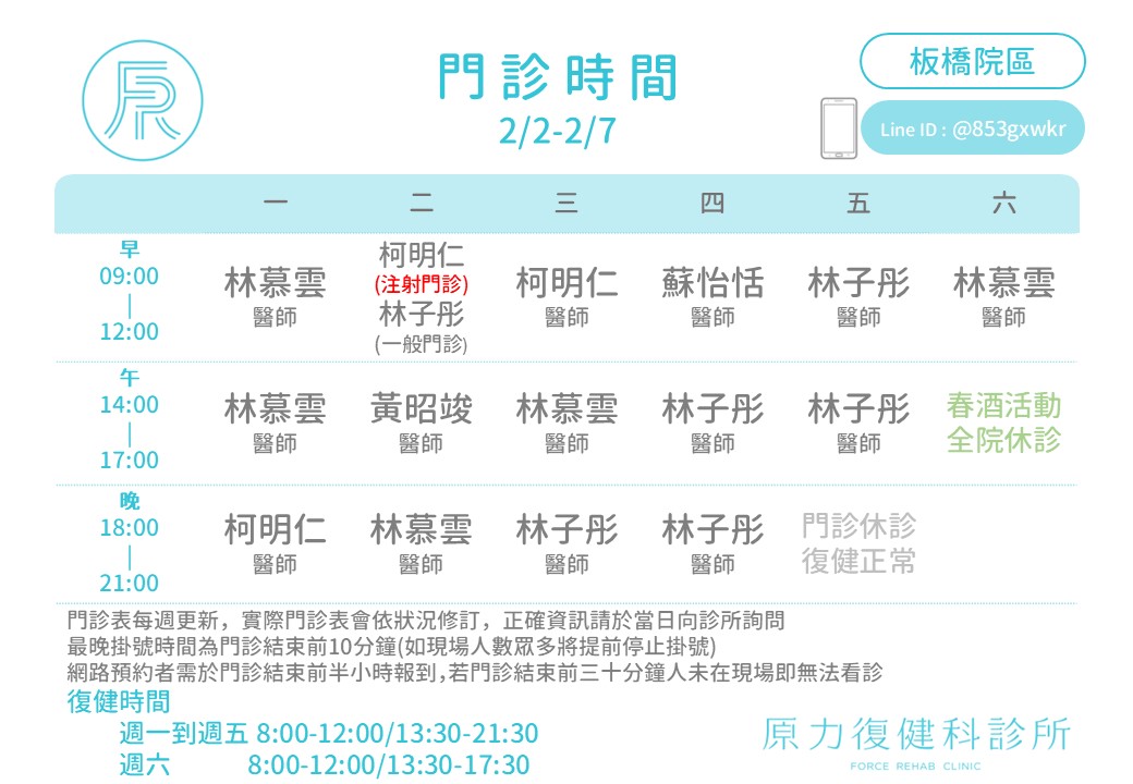 板橋原力復健科診所: http://line.me/ti/p/@853gxwkr