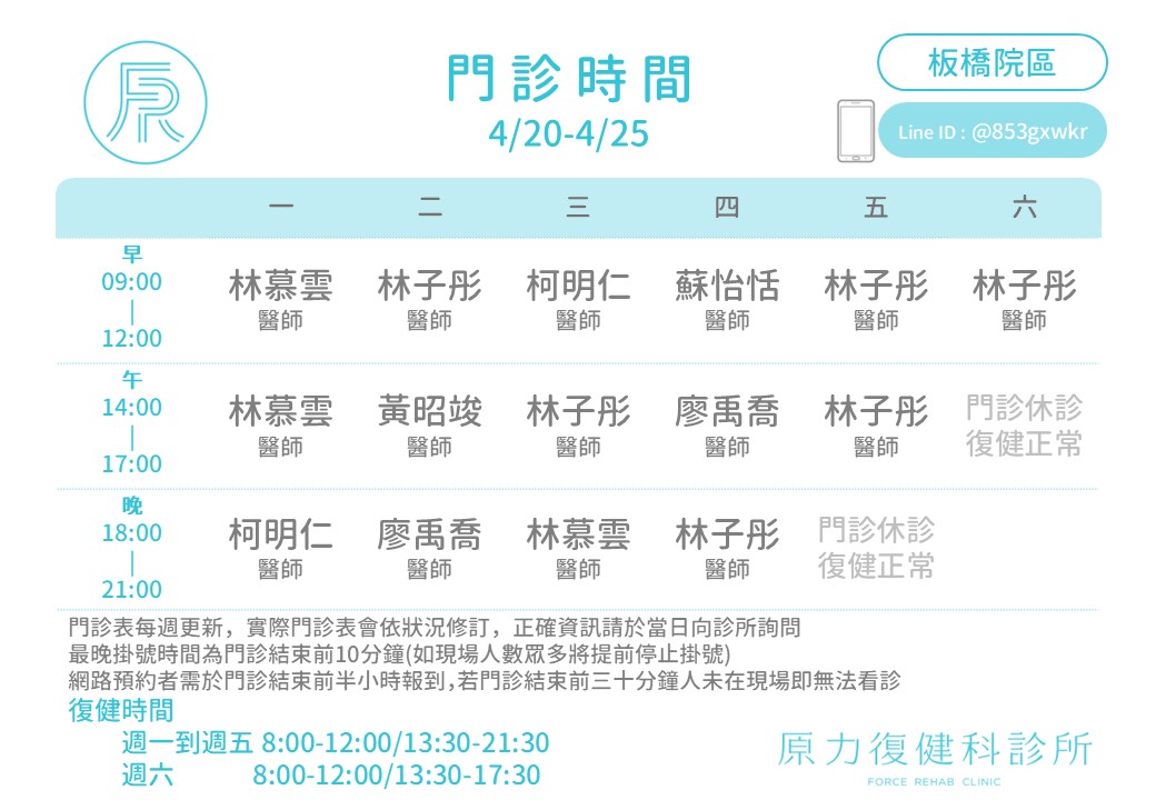 板橋原力復健科診所: http://line.me/ti/p/@853gxwkr