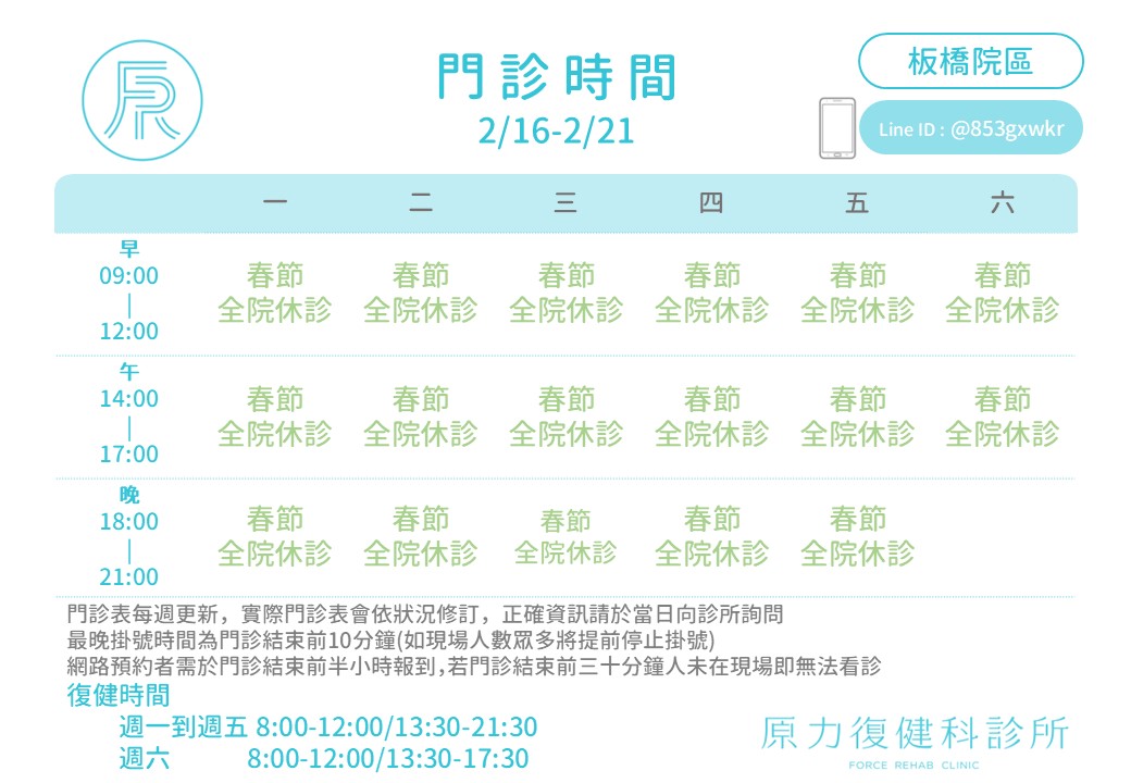 板橋原力復健科診所: http://line.me/ti/p/@853gxwkr