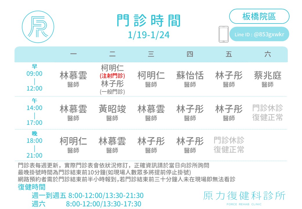 板橋原力復健科診所: http://line.me/ti/p/@853gxwkr