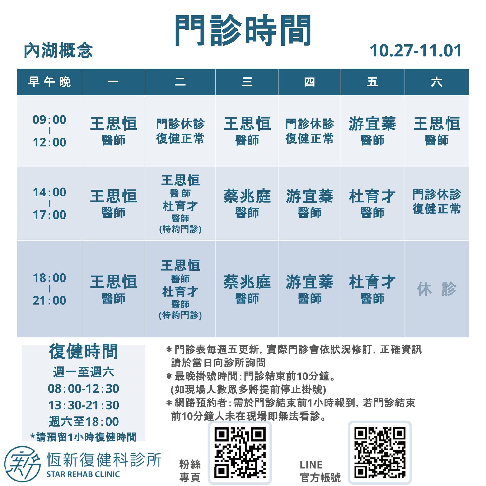 - 門診表每週(五)更新,實際門診表會依狀況修訂;正確資訊請於當日向診所查詢