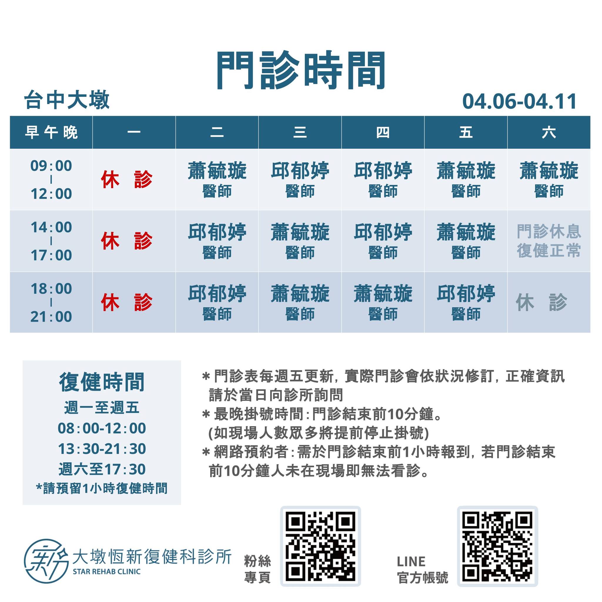 - 週六最晚復健報到時間為17:00(實際門診表會依狀況修訂)