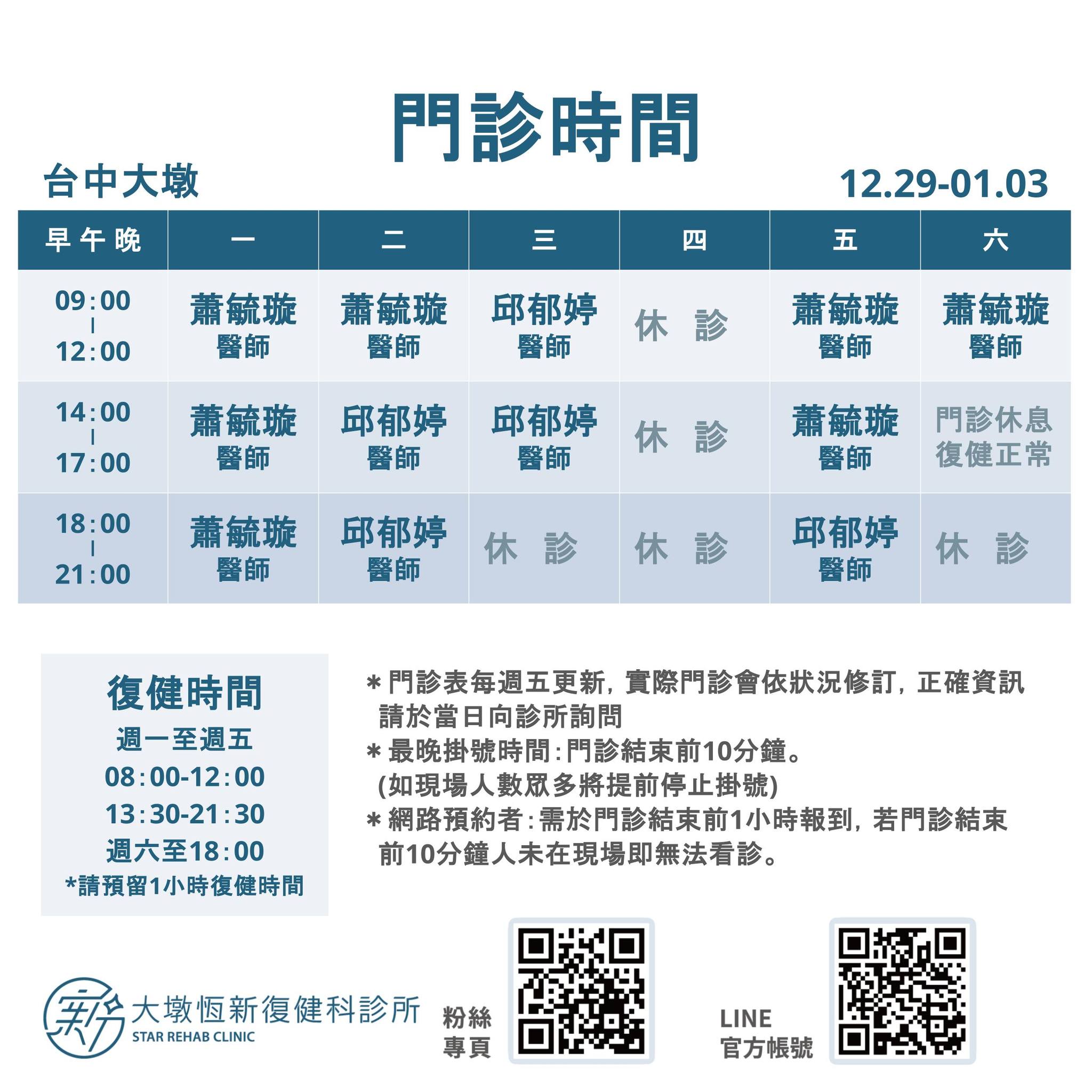 - 週六最晚復健報到時間為17:00(實際門診表會依狀況修訂)