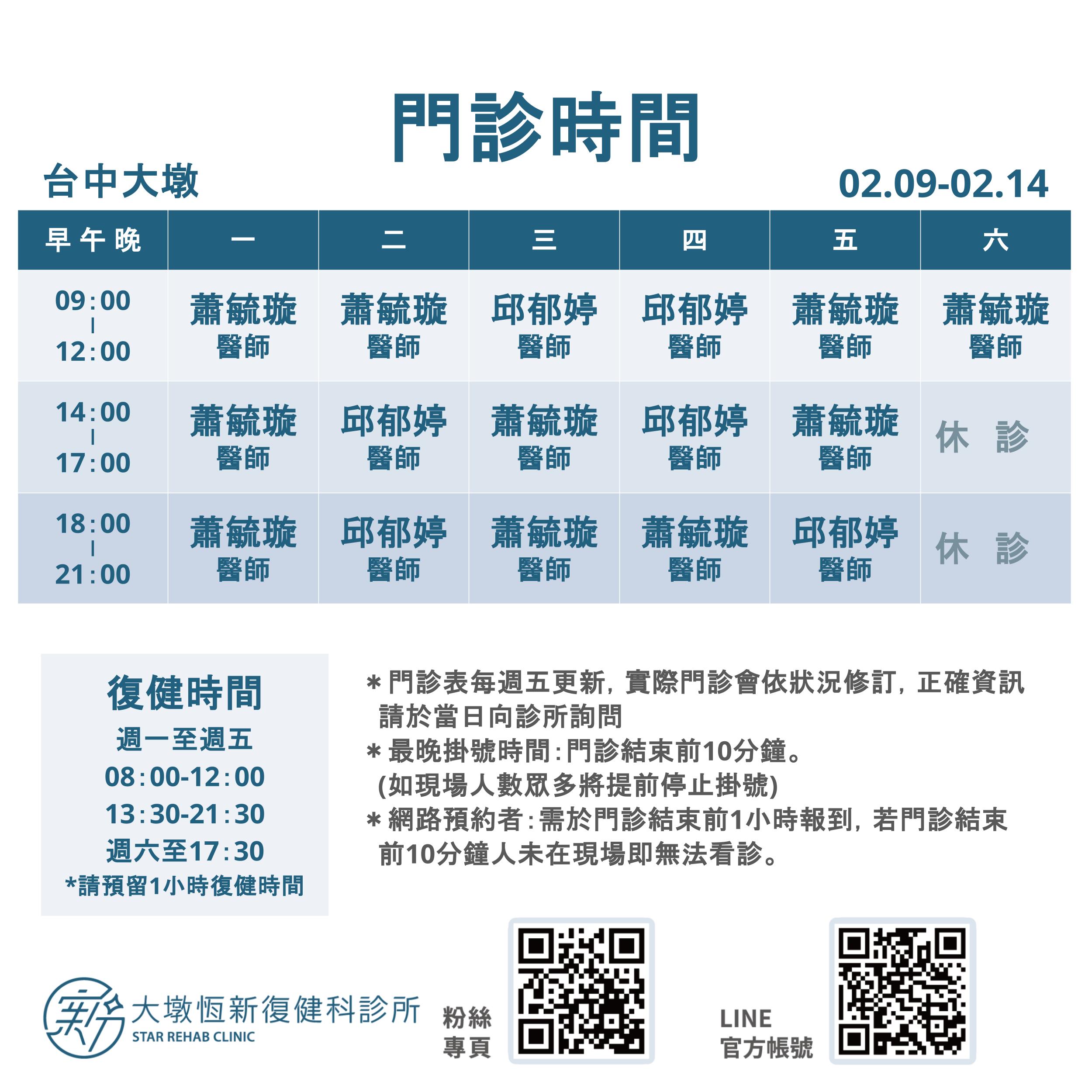 - 週六最晚復健報到時間為17:00(實際門診表會依狀況修訂)