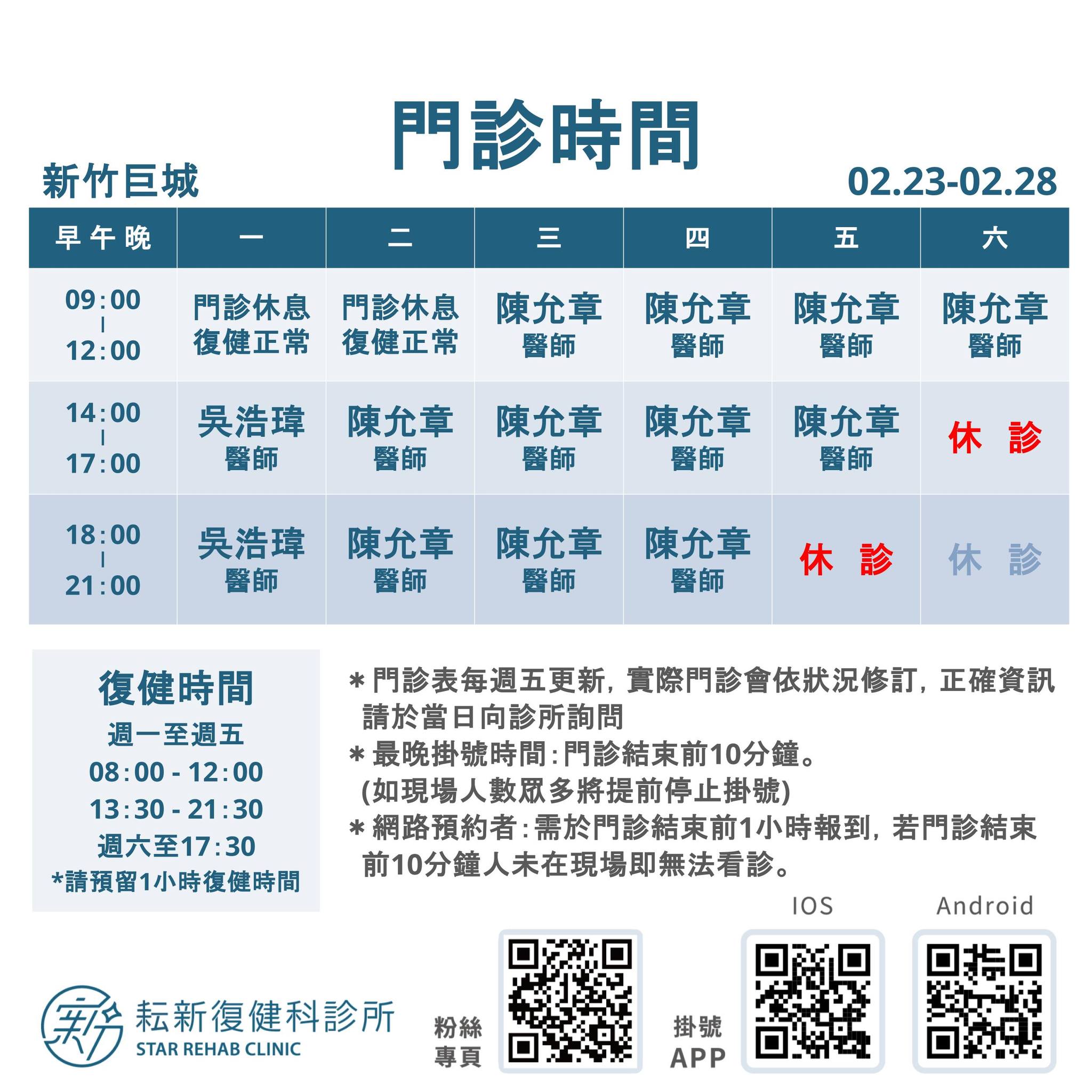 - 週六最晚復健報到時間為17:00(實際門診表會依狀況修訂)